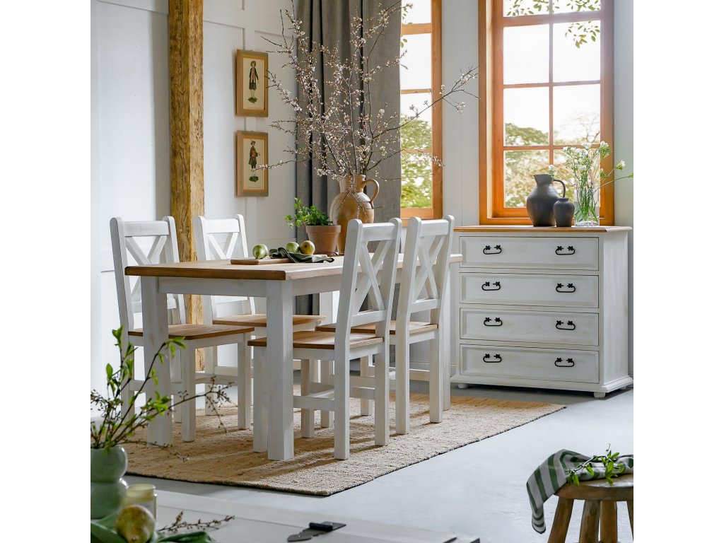 Kolekcia WHITE HOME predstavuje kvalitný biely voskovaný nábytok s efektom patiny, pri ktorom sa nemusíte obávať, že by niekedy vyšiel z módy. Vďaka svojmu nadčasovému vzhľadu a elegancii bude jednoducho stále moderný. Voskovaný nábytok má matný povrch, takže sa nemusíte obávať odtlačkov prstov, ktoré môžu pokaziť celkový dojem aj v dokonale zariadenom interiéri, pretože tento nábytok sa veľmi ľahko udržiava v dokonalej čistote. Okrem toho bielené povrchy dodávajú interiéru moderný charakter a neobmedzené hranice vašej fantázie.