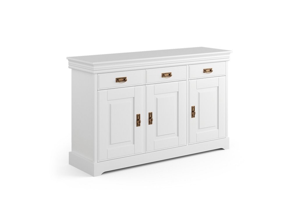 Rustikálna komoda TOSKANIA a skrinky s policami na praktické uloženie všetkých potrebných vecí. Na druhej strane, horná pevná časť je miestom, kde môžete vystaviť kvety alebo svoje obľúbené dekorácie. Kovové úchyty v starožitnom zlatom prevedení podčiarkujú toskánsky štýl tejto trojdverovej komody. Komoda je vybavená systémom tichého zatvárania.