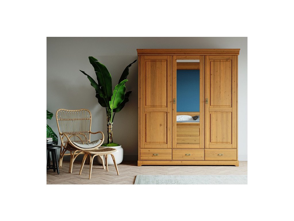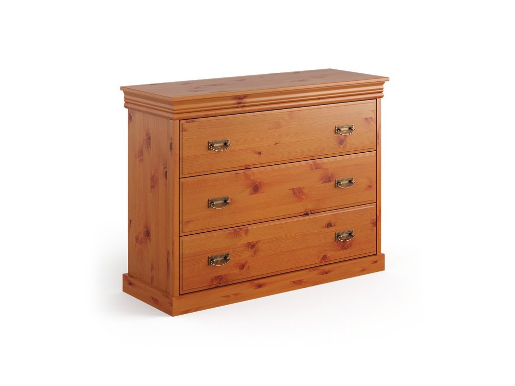 Rustikálna komoda TOSKANIA z masívneho dreva ponúka zásuvky na praktické uloženie všetkých potrebných vecí. Na druhej strane, horná pevná časť je miestom, kde môžete vystaviť kvety alebo svoje obľúbené dekorácie. Kovové úchyty v starožitnom zlatom prevedení podčiarkujú toskánsky štýl tejto trojdverovej komody. Komoda je vybavená systémom tichého zatvárania.