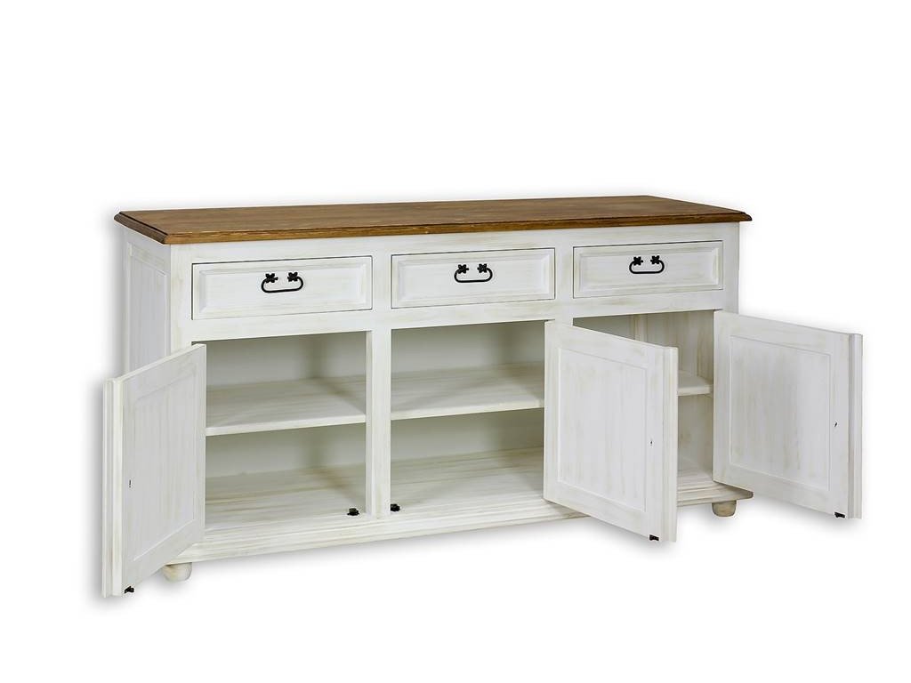 Komoda CORDOBA 01 je vyrobená z masívneho borovicového dreva a ošetrená voskom v bielej alebo dvojfarebnej kombinácii podľa vášho želania. Zadná strana komody je vyrobená zo sololitu. Komoda ponúka skrinky s policami a 3 praktické zásuvky s originálnymi úchytkami.