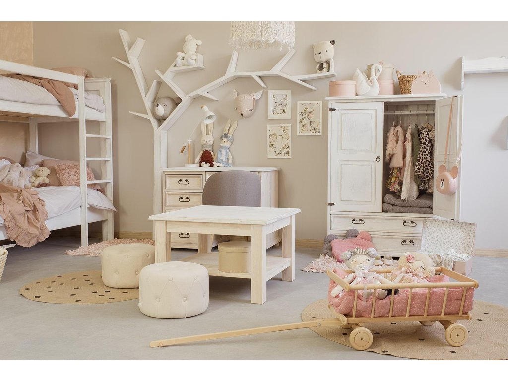 Nábytok WHITE HOME je vyrobený z masívneho borovicového dreva, len chrbty komôd sú vyrobené zo sololitu a chrbty písacích stolov z prírodnej dyhy. Zásuvky nemajú koľajničky, ale ich absencia nebráni plynulému vysúvaniu. Konečná povrchová úprava nábytku spočíva v ručnom nanášaní čistých prírodných voskov, vďaka ktorým je nábytok krásny a hodvábne jemný. Vosk sa na konzervovanie dreva používa už od stredoveku. Je to prírodný materiál, ktorý má priaznivé účinky na drevo a drevený nábytok. Efektný vzhľad nábytku dotvára štýlové kovanie a závesy v čiernej farbe.