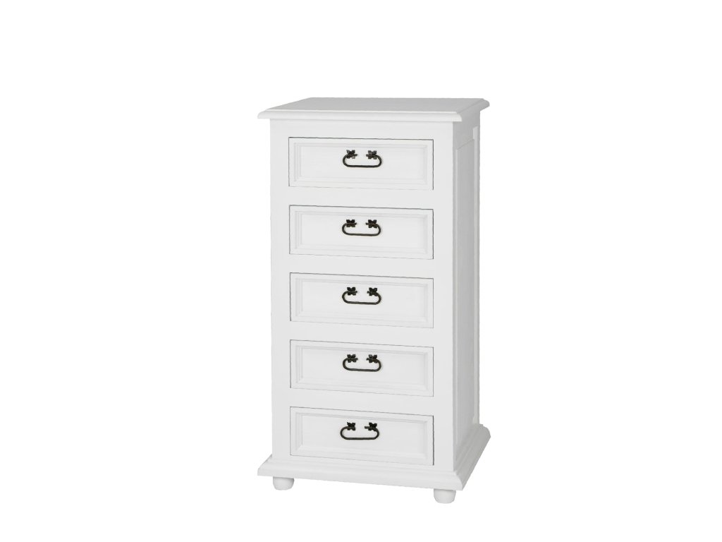Komoda CORDOBA 09 je vyrobená z masívneho borovicového dreva a ošetrená voskom v bielej alebo dvojfarebnej kombinácii podľa vášho želania. Zadná strana komody je vyrobená zo sololitu. Komoda pozostáva z piatich zásuviek s pôvodnými úchytkami, ktoré sú upevnené na drevených koľajničkách. Komoda stojí na štyroch guľovitých nohách.
