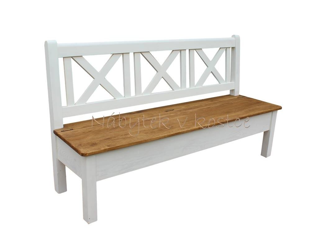 Rustikálna lavica SWEET HOME s úložným priestorom je vyrobená z masívneho borovicového dreva a ošetrená bielou vodou riediteľnou farbou. Vrchná doska je ošetrená farebným pigmentom v odtieni svetlej medovej hnedej a následne nalakovaná.