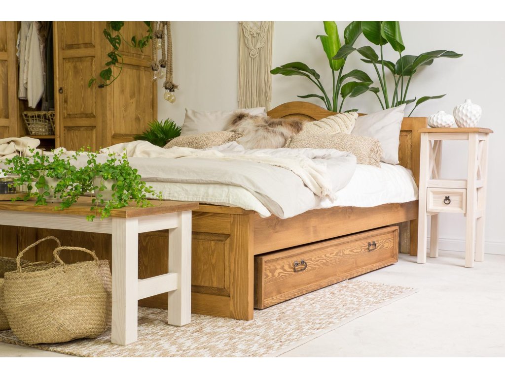 Rustikálna posteľ CORDOBA je vyrobená z masívneho borovicového dreva, ktoré do vášho domova prinesie teplé tóny a nádhernú vôňu. Použitie vysokokvalitného vosku na prírodnej báze tiež pomáha chrániť nábytok a dodáva drevu jeho osobitnú krásu.