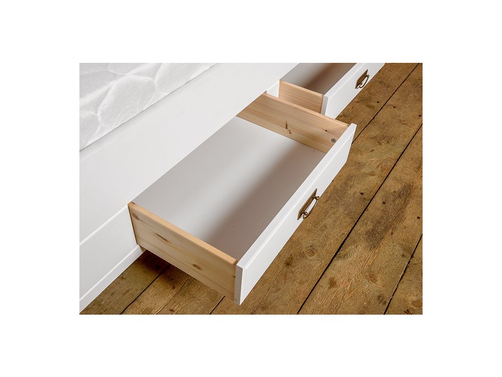 Rustikálna posteľ z masívu TOSKANIA je vyrobená z masívnej fínskej borovice a ošetrená bielou vodou riediteľnou farbou, ktorá rozžiari každý interiér vášho domova. Fínska borovica vyniká svojou odolnosťou a krásnou štruktúrou dreva, ktorú cítiť pri každom dotyku. Dná zásuviek sú vyrobené z drevovláknitej dosky HDF.