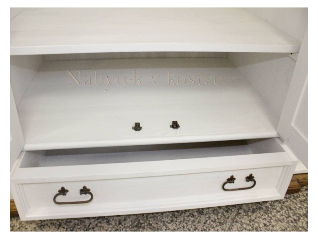 Vnútorný rustikálny šatník SWEET HOME ponúka šatníkovú tyč za dvojitými dverami. V pravej časti sú police, v spodnej časti sú zásuvky na uloženie všetkého, čo máte radi. Štýlové úchytky v retro štýle s efektom patiny dodávajú skrini nadčasovú eleganciu.