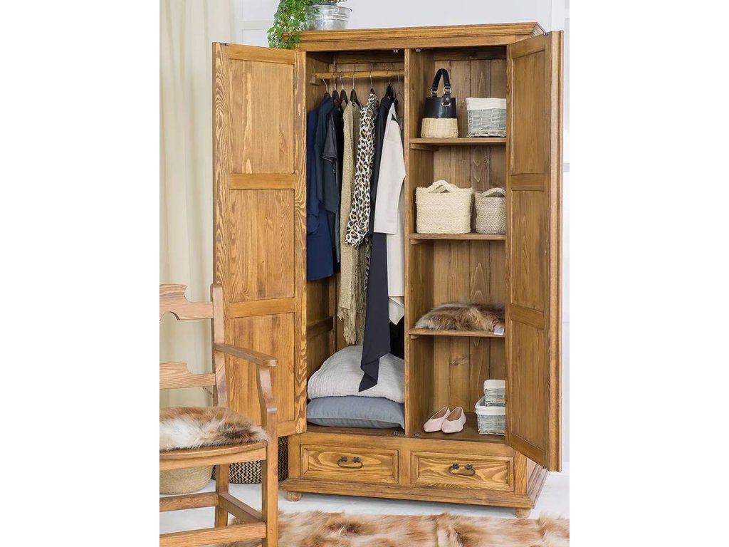 Rustikální šatní skříň WHITE HOME je vyrobena z borovicového masivu vysoké kvality a ošetřena voskem na přírodní bázi. Za povšimnutí určitě stojí její originální úchyty a kování černé barvy. Záda skříně jsou vyrobeny rovněž ze dřeva. Skříň nabízí police i šatní tyč a ve spodní části praktické výsuvné šuplíky.
