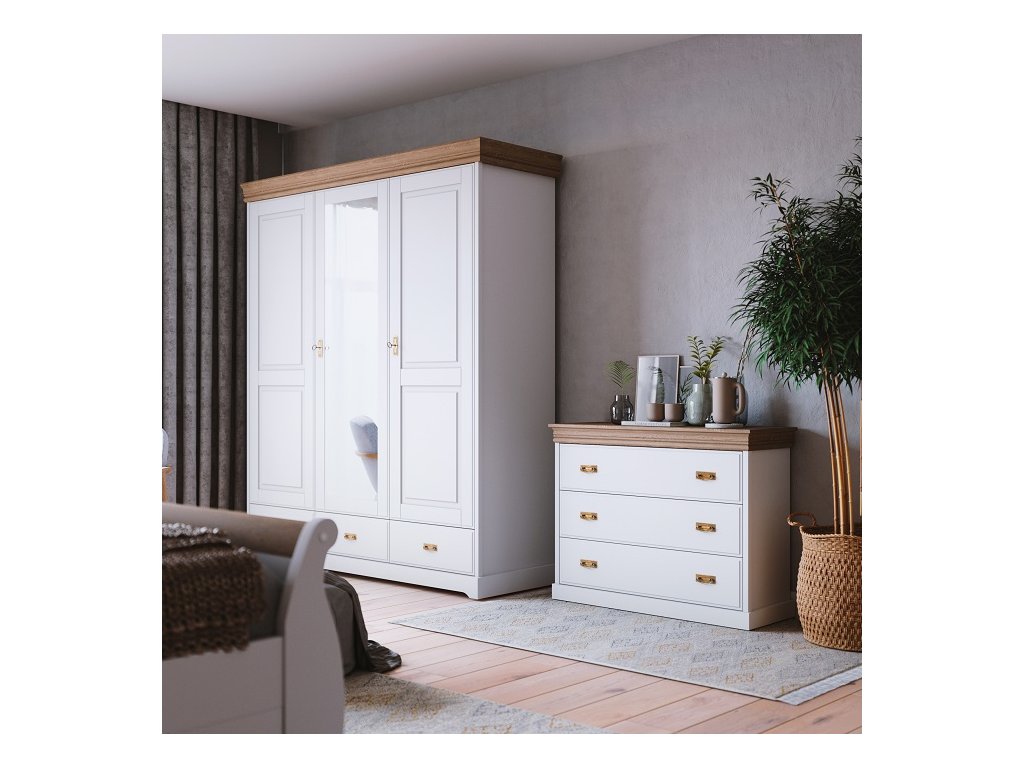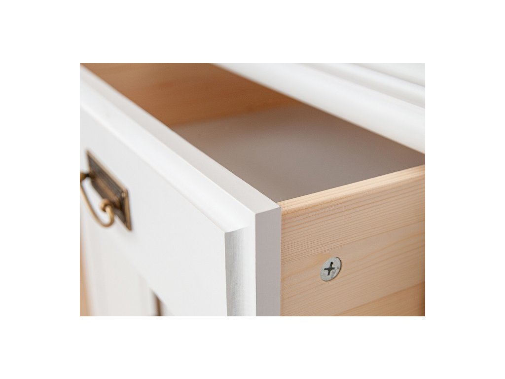 Rustikálna komoda z masívneho dreva TOSKANIA je vyrobená z masívnej fínskej borovice a ošetrená bielou vodou riediteľnou farbou, ktorá rozžiari každý interiér vášho domova. Vrchná doska je zafarbená do medového odtieňa. Fínska borovica vyniká svojou odolnosťou a krásnou štruktúrou dreva, ktorú cítiť pri každom dotyku. Dná zásuviek a zadná časť komody sú vyrobené z drevovláknitej dosky HDF.