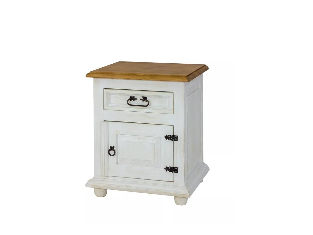 Nočný stolík CORDOBA 15 je vyrobený z masívneho borovicového dreva a ošetrený voskom v bielej alebo dvojfarebnej kombinácii podľa vášho želania. Zadná časť je vyrobená zo sololitu. Komoda pozostáva z dvoch zásuviek s pôvodnými úchytkami, ktoré sú upevnené na drevených koľajničkách. Komoda stojí na štyroch guľovitých nohách.