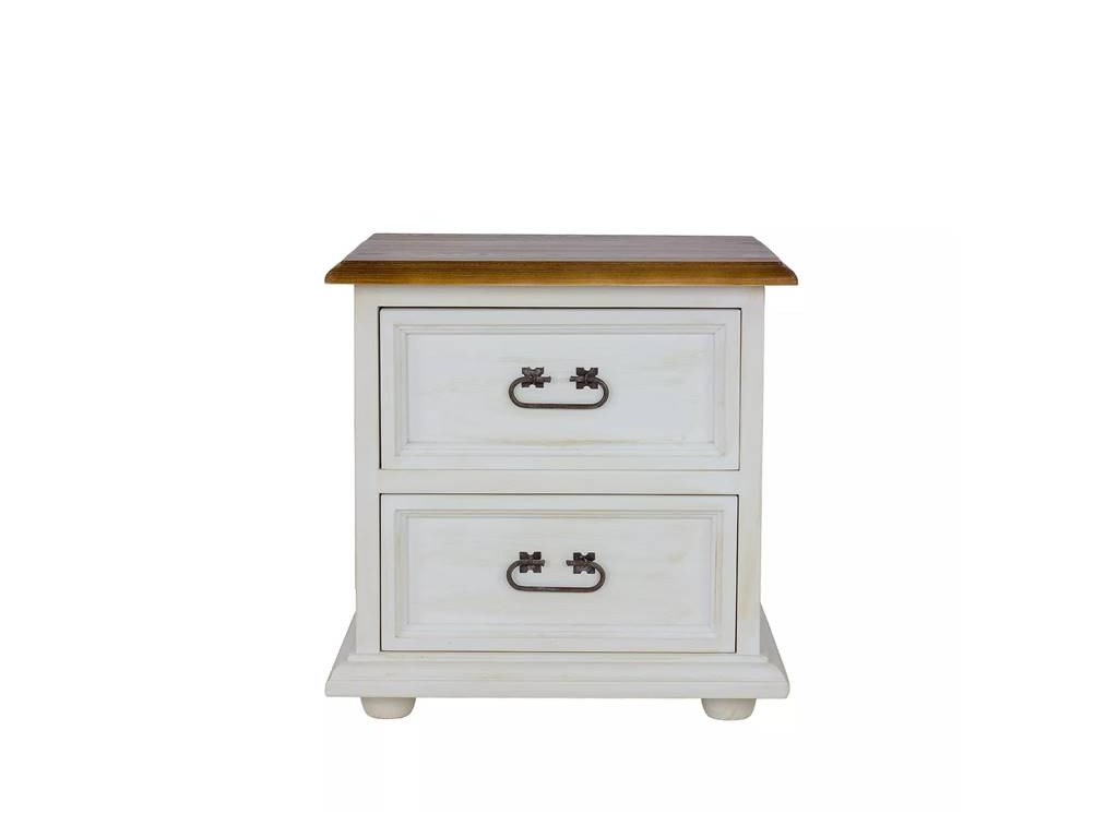 Nočný stolík WHITE HOM je vyrobený z masívneho borovicového dreva a ošetrený voskom v bielej alebo dvojfarebnej kombinácii podľa vášho želania. Zadná časť je vyrobená zo sololitu. Nočný stolík pozostáva z dvoch zásuviek s pôvodnými úchytkami, ktoré sú upevnené na drevených koľajničkách. Komoda stojí na štyroch guľovitých nohách.