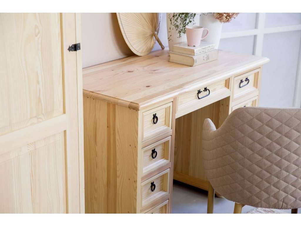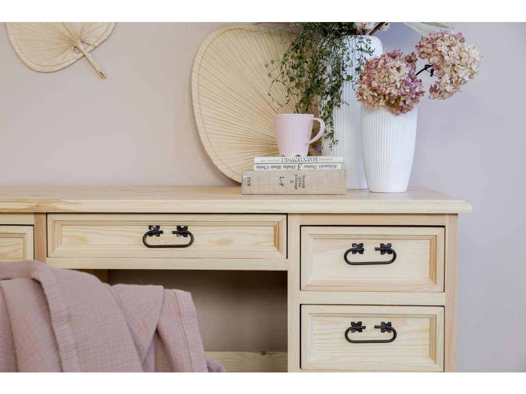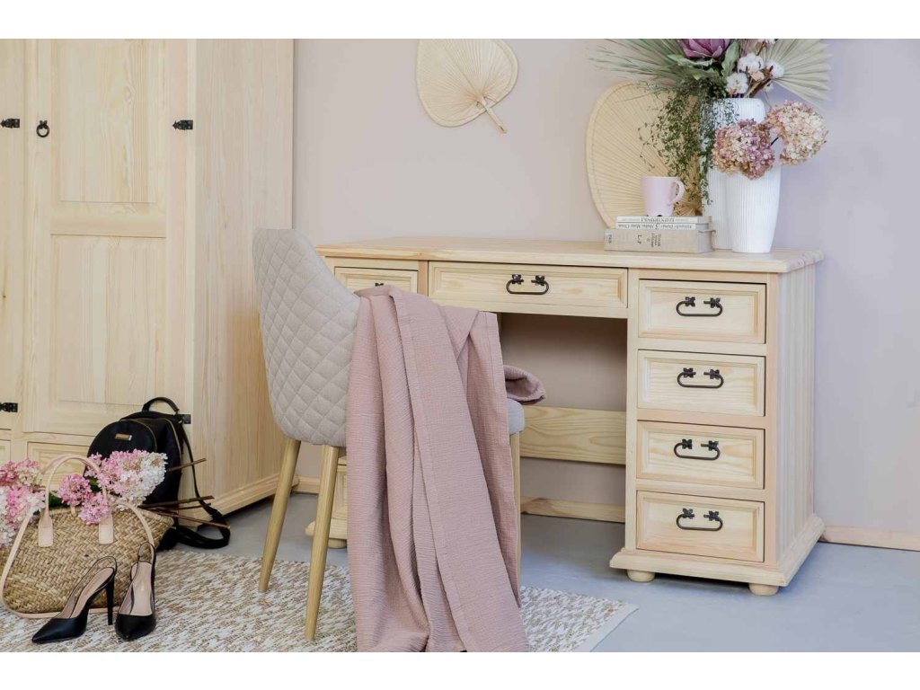 Písací stôl CORDOBA je vyrobený z kvalitného borovicového masívu. Zadná strana stola je vyrobená z drevenej dyhy a zásuvky sú v spodnej časti vyrobené z preglejky. Čelá zásuviek sú vybavené štýlovým kovaním.