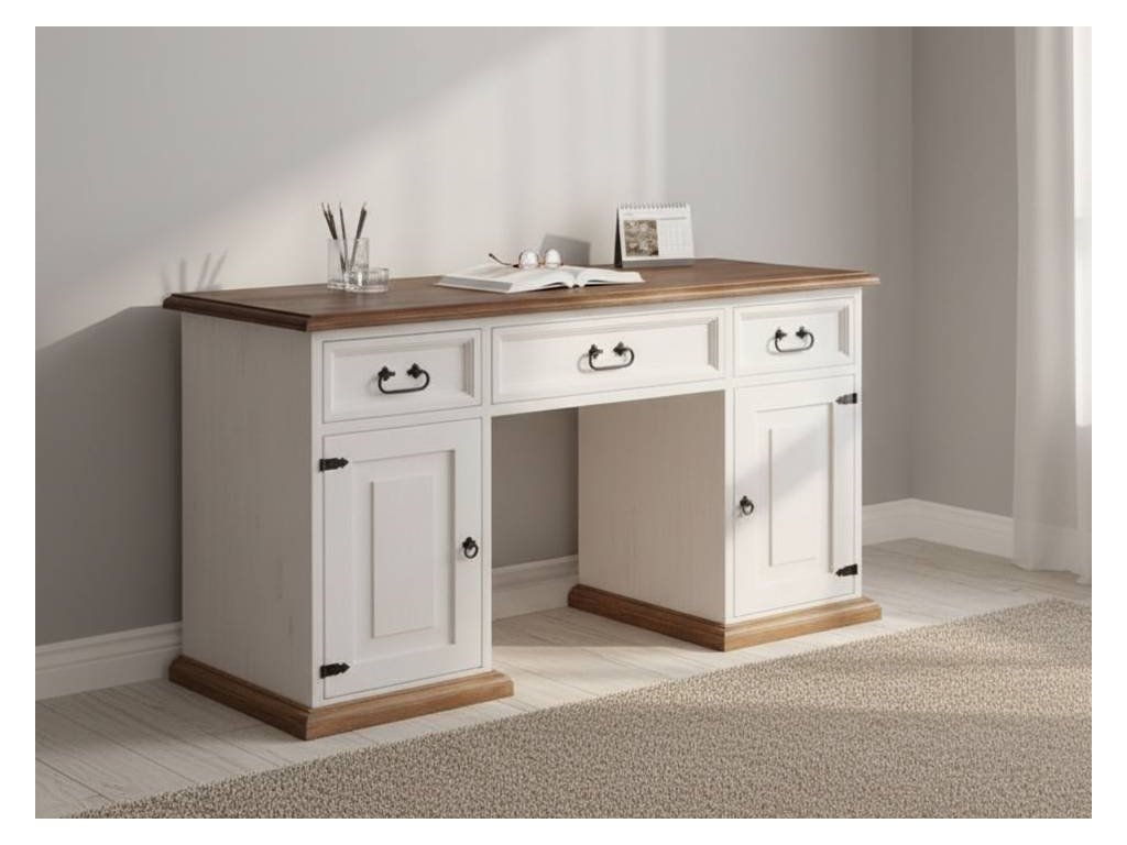 Stôl SWEET HOME má množstvo úložných priestorov. Stôl ponúka 4 zásuvky a dvierka s ozdobným frézovaním a masívnu zásuvku uprostred. Dvierka a zásuvky majú ozdobné frézovanie, ktoré dodáva stolu rustikálny charakter a romantický vzhľad.