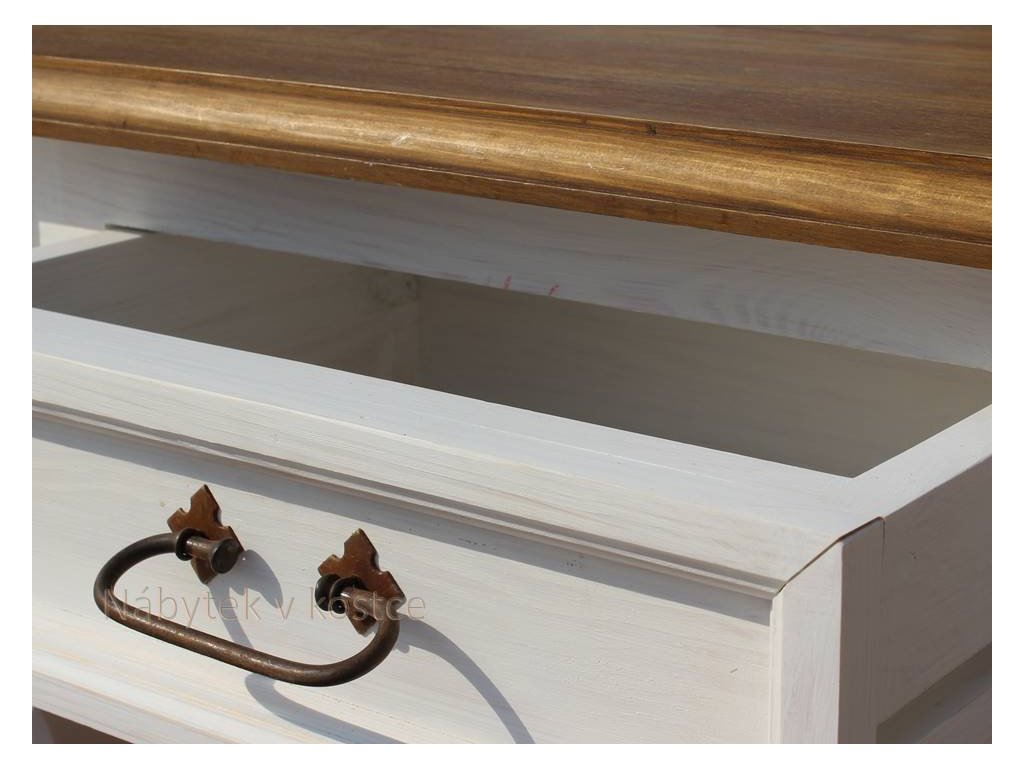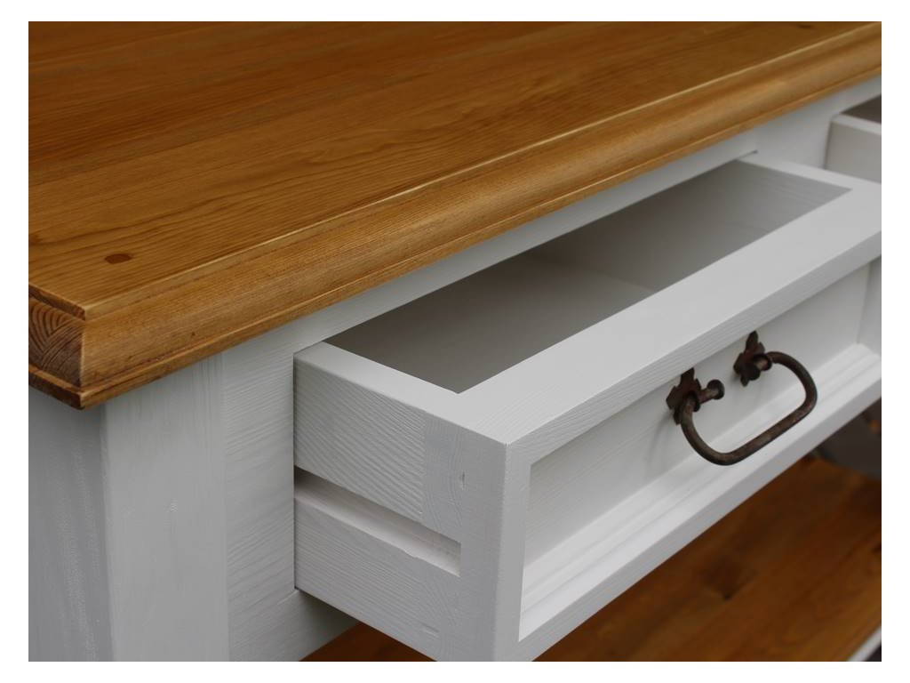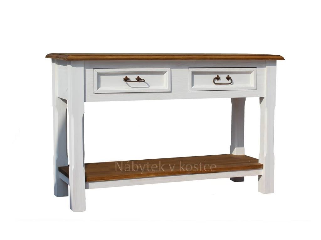 Rustikální konzolový stolek SWEET HOME je masivní stolek se šuplíky, vyrobený z borovicového masivního dřeva a ošetřen pouze bílou vodou ředitelnou barvou, anebo ve dvoubarevné kombinaci (viz. vzorník). Pro snazší údržbu doporučujeme objednat nábytek s vrchní hnědou deskou v lakované verzi.
