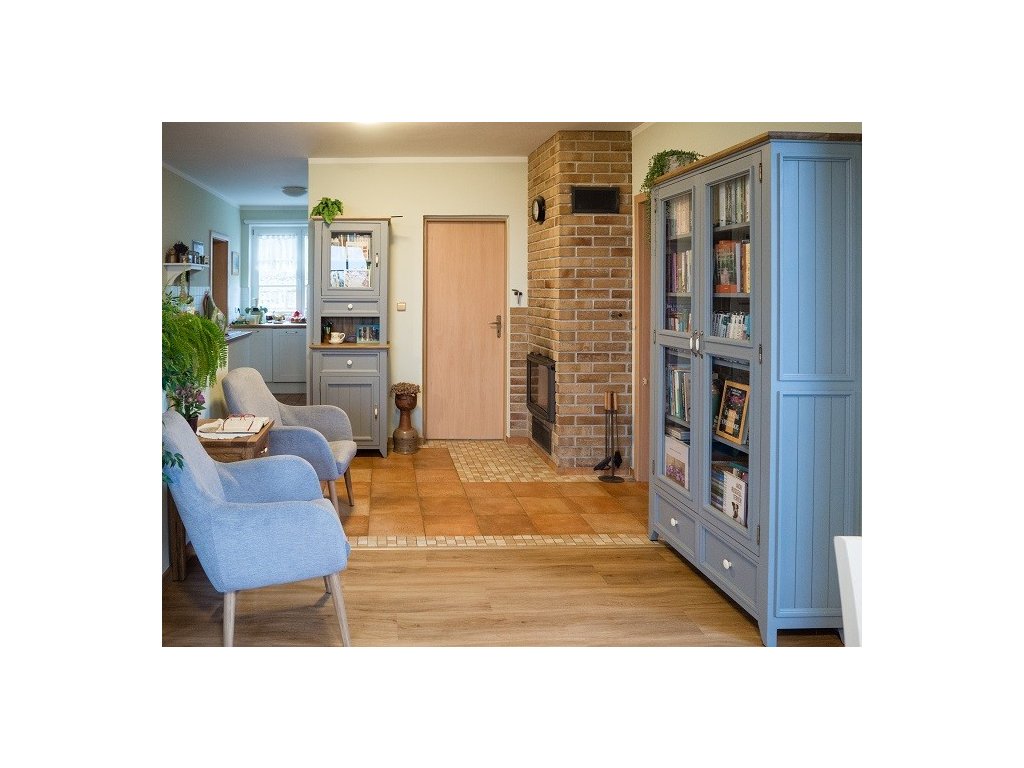 Masivní provensálská knihovna PROVENCE je spojením bukového a dubového dřeva. Dubové dřevo (horní deska) je ošetřeno lakem a bukové dřevo je ošetřeno akrylovou barvou v šedomodré barvě.