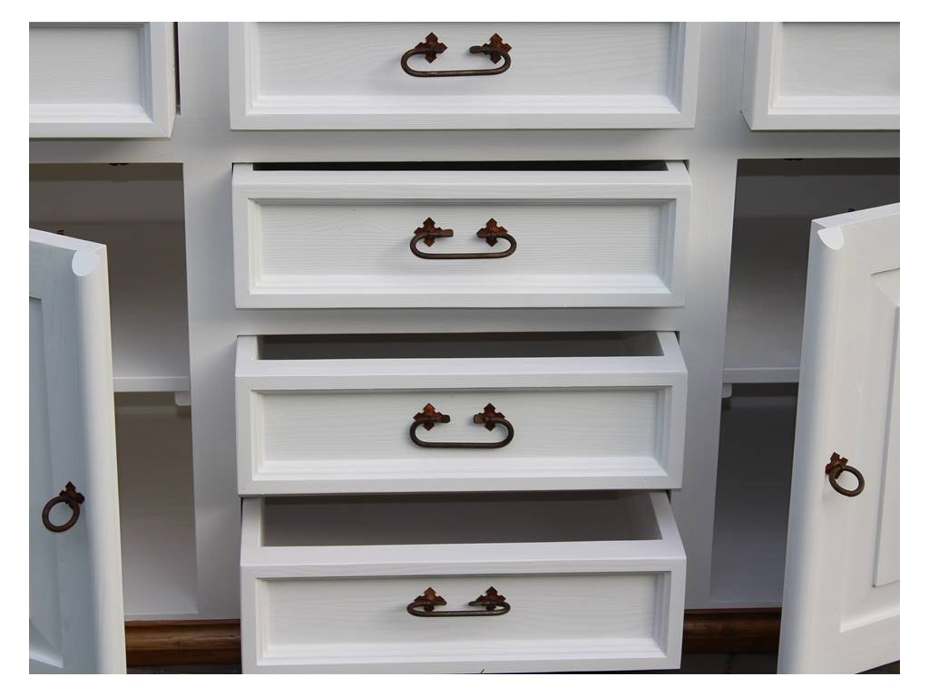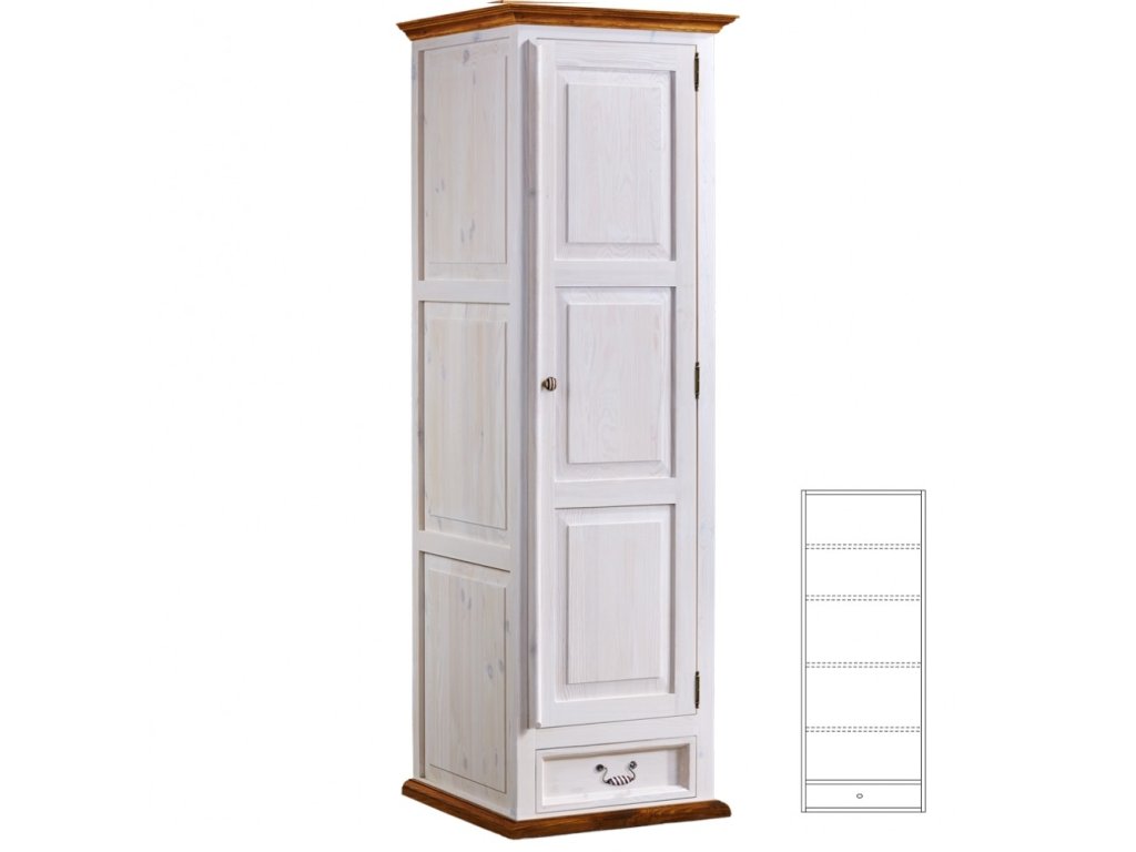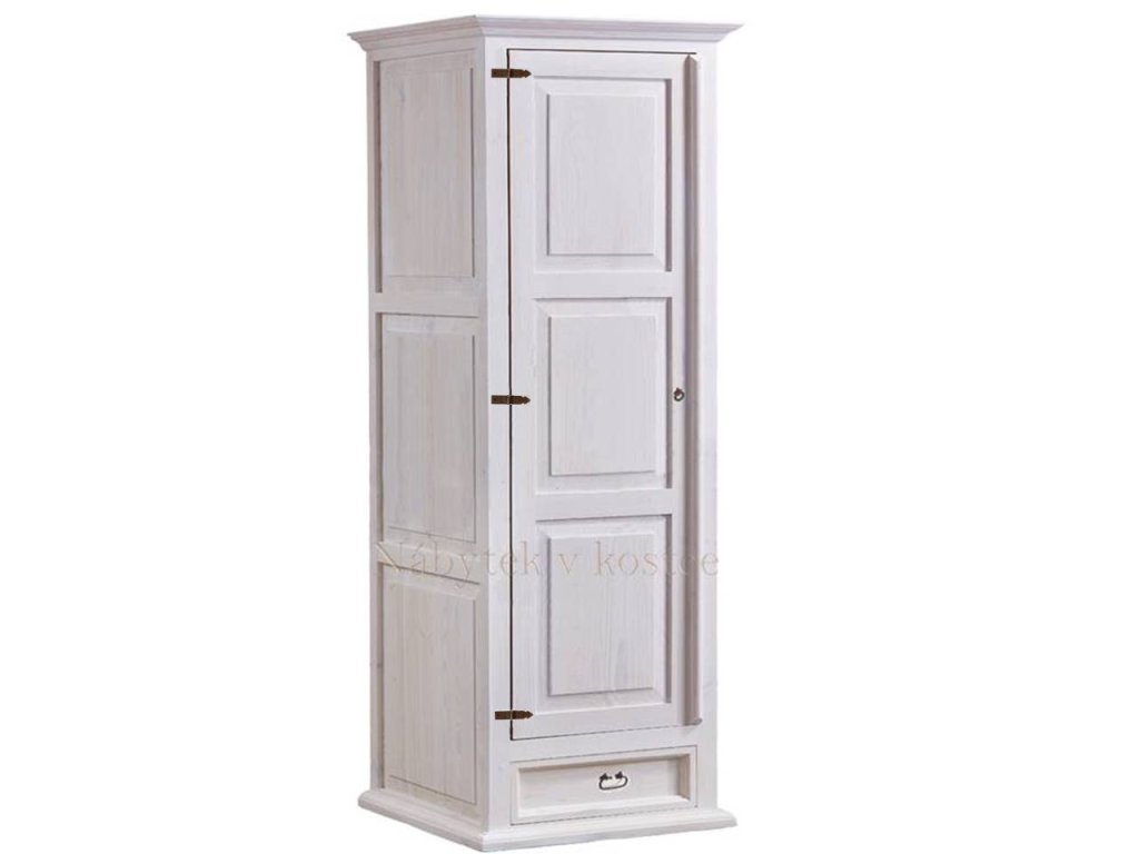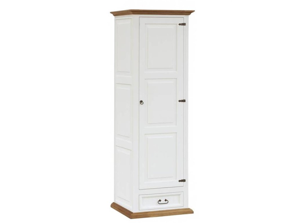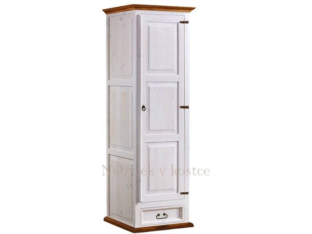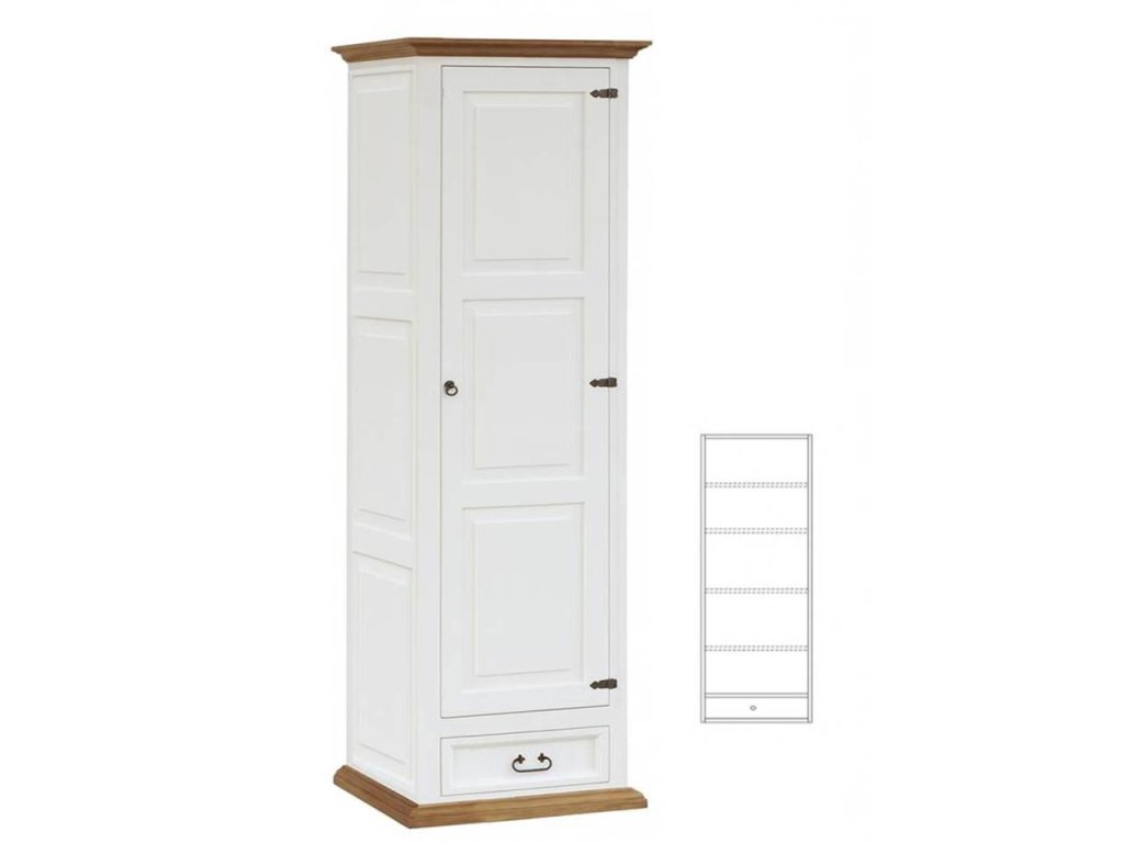 Rustikálny šatník SWEET HOME je masívna skriňa vyrobená z masívneho borovicového dreva (iba zadná strana je dyhovaná) a ošetrená bielou vodou riediteľnou farbou. Hnedé časti možno ošetriť voskom alebo lakom. Z dreva sú vyrobené aj zásuvkové lišty a police. Skriňu je možné zakúpiť aj ako ako dvojdverovú i trojdverová. Ponúkame aj možnosť výberu otvárania dverí - vpravo alebo vľavo (uveďte prosím v poznámke). Hrúbka bokov skrinky - 4 cm, sokel - 3 cm, veniec - 4 cm, hrúbka dvierok - 2,5 cm, dĺžka zásuvky - 44,5 cm, vnútorná dĺžka zásuvky - 40,5 cm, hĺbka zásuviek - 13 cm. Priestor medzi policami je 39 cm, len priestor medzi hornou policou je 45 cm.