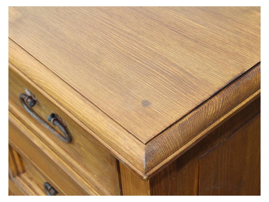 Rustikální skříňka MEXICANA je celomasivní komoda vyrobena z borovicového masivního dřeva (jen zadní stranu tvoří dřevěná dýha) a ošetřena voskem nebo lakem, dle výběru (vosk světle hnědý-medový, ořech, kaštan, dub tmavý, dub kouřový anebo vosk bezbarvý). Ze dřeva jsou rovněž vyrobeny i pojezdy na šuplíky a police.