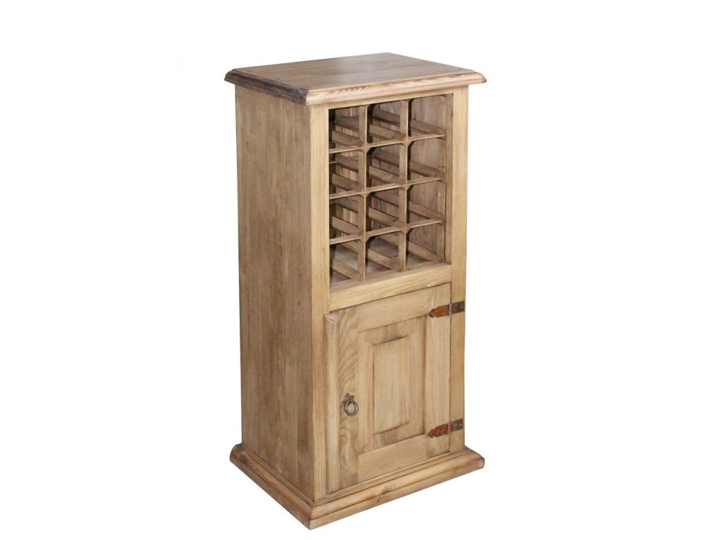 Rustikální skříňka MEXICANA je komoda na víno z borovicového masivu v rustikálním stylu, nebo-li stojan na víno, jenž se stává módní a velmi vyhledávaným nábytkem našich zákazníku. Skřínka na víno zaručí šetrné uložení Vašeho oblíbeného vína, stejně tak zaručí profesionální efekt, který tímto nábytkem vytvoříte v interiéru Vaši kuchyně, obývacího pokoje či vinotéky. Vnitřní prostory skříně nejsou ošetřeny voskem, jsou ošetřeny pouze bezbarvým nátěrem tak, aby co nejvíce vynikla krása přírodního dřeva.