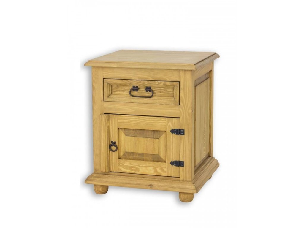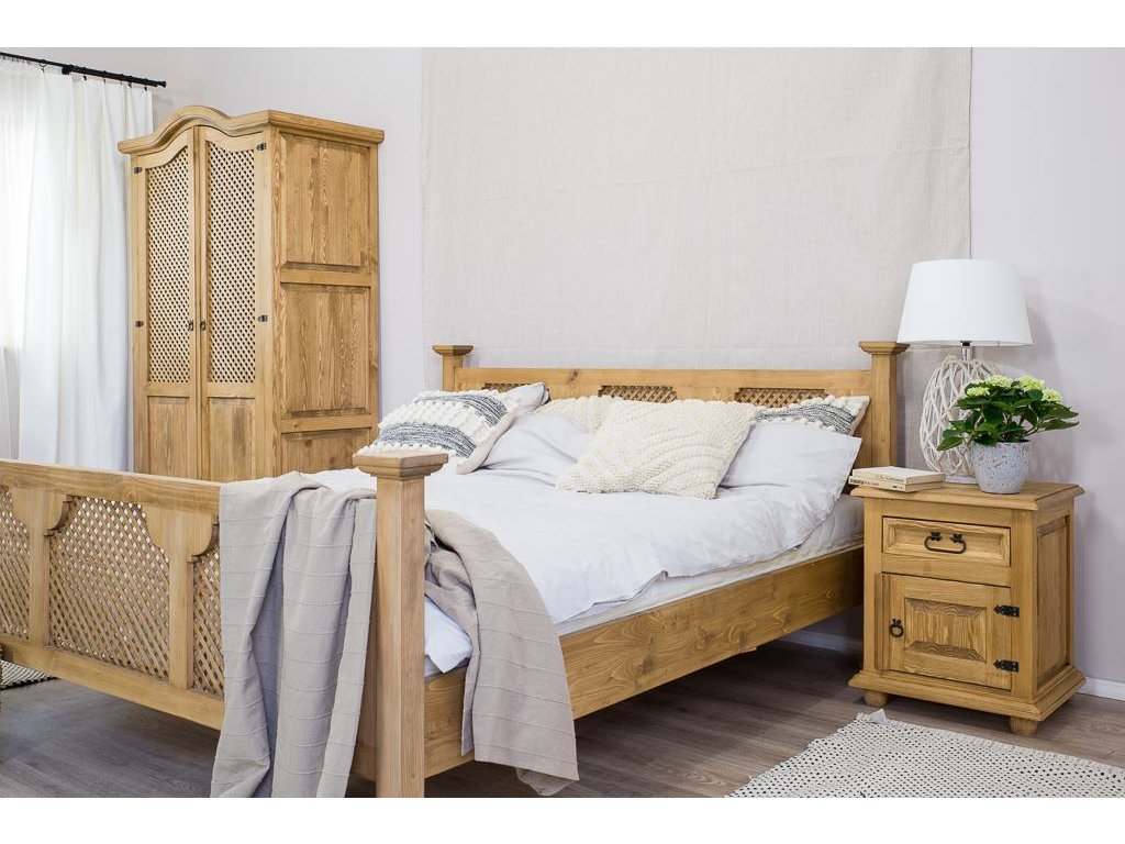 Spálňa CORDOBA 01 je súprava kvalitného nábytku z masívneho borovicového dreva. Drevo je ošetrené prírodným voskom, ktorý zvýrazňuje prirodzenú štruktúru dreva. Nábytok dopĺňajú štýlové kovové úchyty a pánty v čiernej farbe. Spálňa je celomasívna, len zadná strana nočného stolíka je zo sololitu. Dvere šatníka sú čiastočne mrežované, a preto pôsobia vzdušne a dekoratívne.