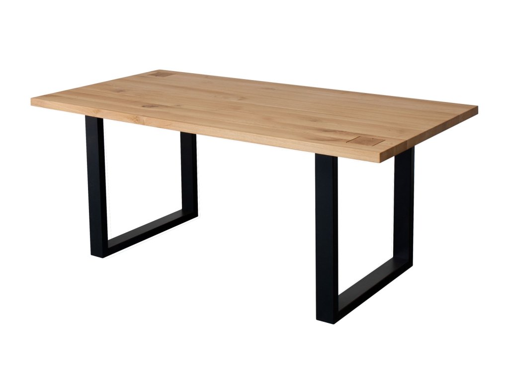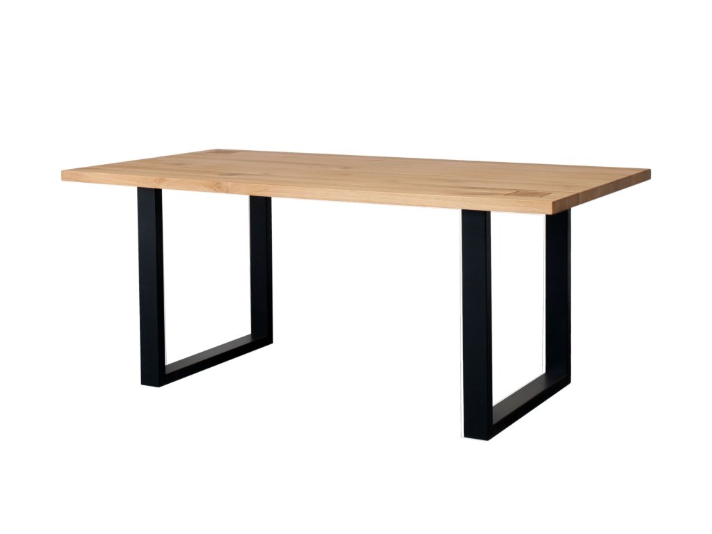 Stôl REGATA na prvý pohľad zaujme svojou nápaditou konštrukciou, ktorú tvoria stabilné, navzájom prepojené kovové nohy, ktoré nádherne kontrastujú s prirodzene teplou farbou dubového masívu. Dosku stola zdobia dva malé štvorce vyrezané z dubového trámu, ktoré dokonale dopĺňajú prirodzenú kresbu dubového dreva a početné suky zvýraznené olejovou farbou.