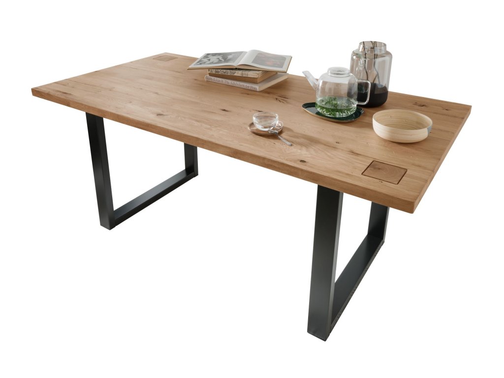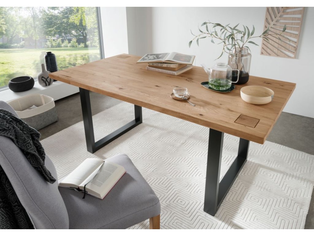 Stôl REGATA 180x90 cm z masívneho dreva vás na prvý pohľad zaujme svojou zaujímavou konštrukciou. Teplá dubová doska z masívneho dreva je umiestnená na dvojitej čiernej kovovej podnoži, ktorá zaručuje neochvejnú stabilitu stola a zároveň mu dodáva industriálny šarm. Masívnu dubovú dosku dopĺňajú dva malé štvorce vyrezané z dubového trámu, ktoré nádherne korešpondujú s prirodzenou kresbou dreva a nepravidelnými súknami duba, vďaka čomu nábytok vyzerá jedinečne.