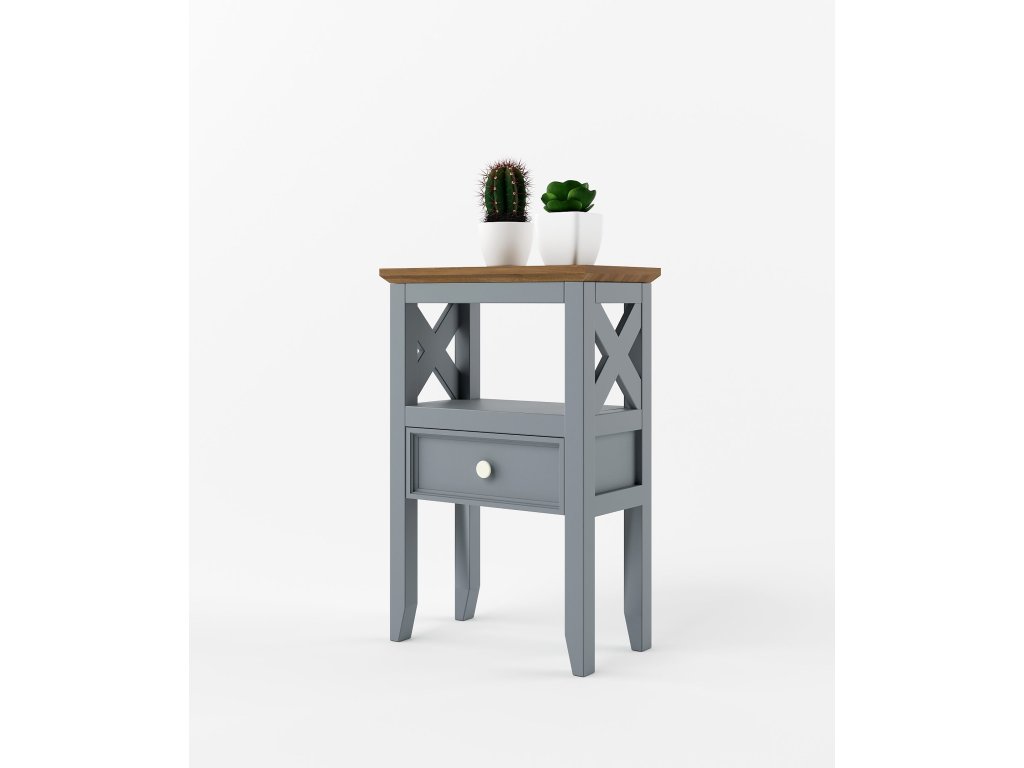 Masivní stolek PROVENCE je spojením bukového a dubového dřeva. Dubové dřevo (horní deska) je ošetřeno lakem a bukové dřevo je ošetřeno akrylovou barvou v šedomodré barvě. Šuplík je bez pojezdů.