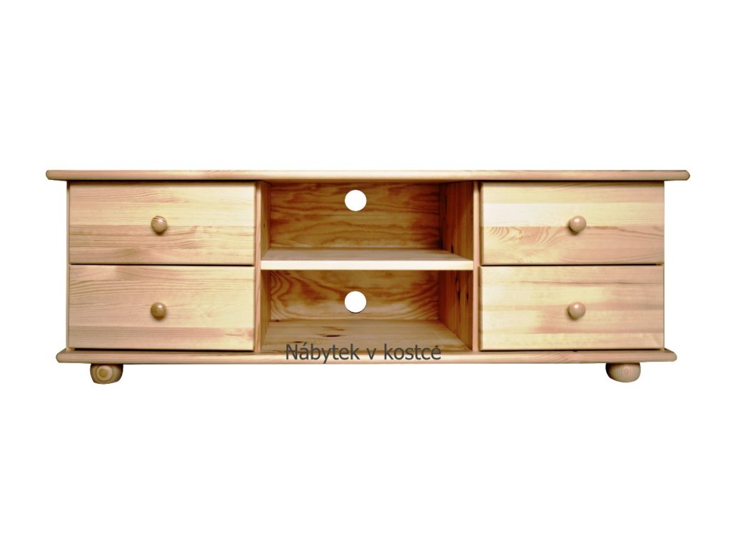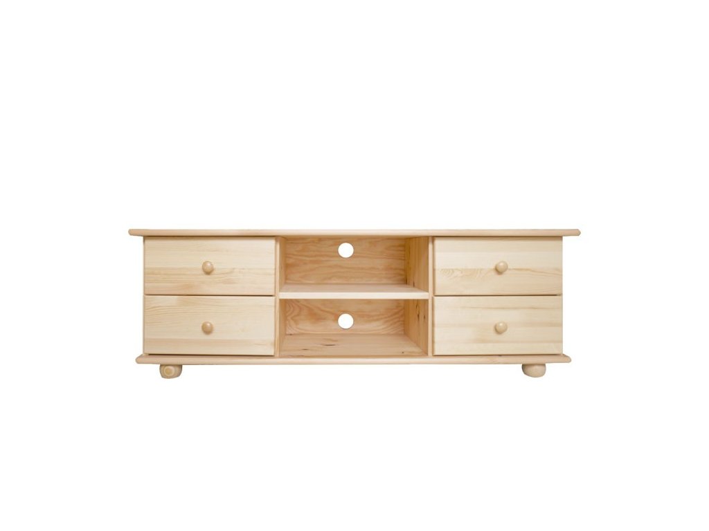 Televizní stolek DEJ61 se skládá ze 4 výsuvných šuplíků, které jsou uchyceny na kvalitních kovových pojezdech a z 1 poličky. Úchytky jsou roztomile kulaté, rovněž z borovicového masívu. V zadní části televizního stolku jsou kulaté otvory na kabely, takže se nemusíte trápit složitým vyřezáváním nebo schováváním kabelů. Celý televizní stolek je postaven na 4 kulatých nožkách.