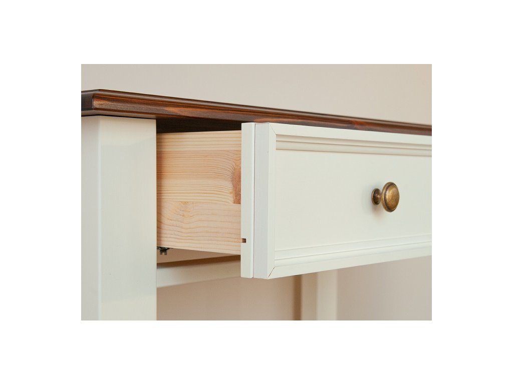 Rustikálny toaletný stolík BELLUNO Elegante z masívneho dreva je vyrobený z masívnej fínskej borovice. Teplá biela farba, ktorá pokrýva povrch nábytku, krásne vyplní interiéry v provensálskom štýle, ako aj interiéry v škandinávskom štýle. Fínska borovica vyniká svojou odolnosťou a krásnou štruktúrou dreva, ktorú cítiť pri každom dotyku.