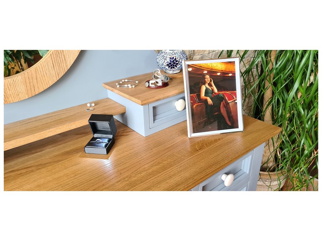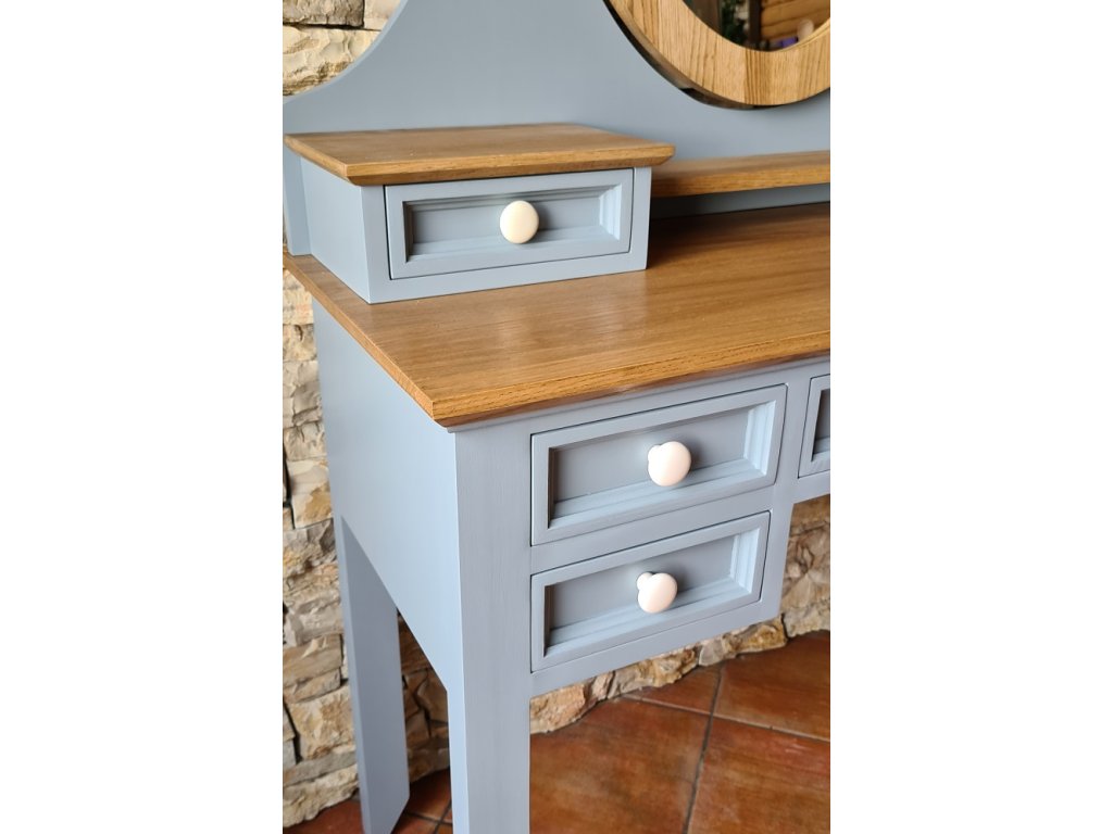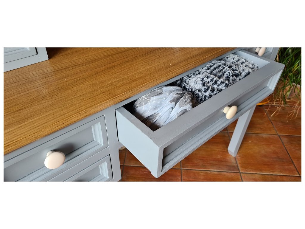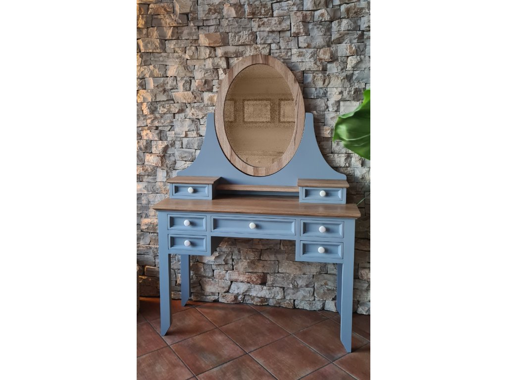 Masívny toaletný stolík PROVENCE je kombináciou bukového a dubového dreva. Dubové drevo (vrchná doska) je ošetrené lakom a bukové drevo je ošetrené akrylovou farbou sivomodrej farby. Zásuvky sú bez posunu. Možno objednať so systémom tichého zatvárania (pre zásuvky) - cena na vyžiadanie.