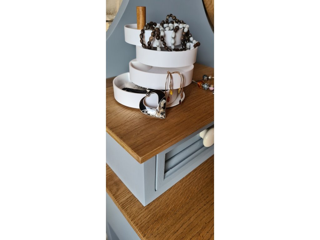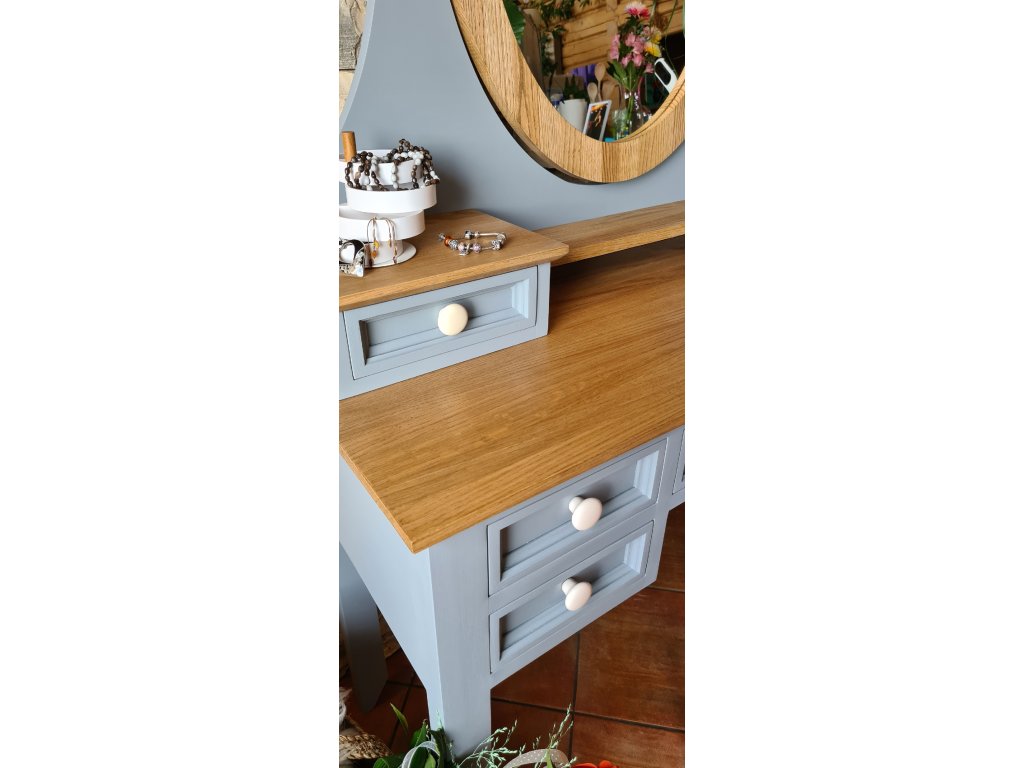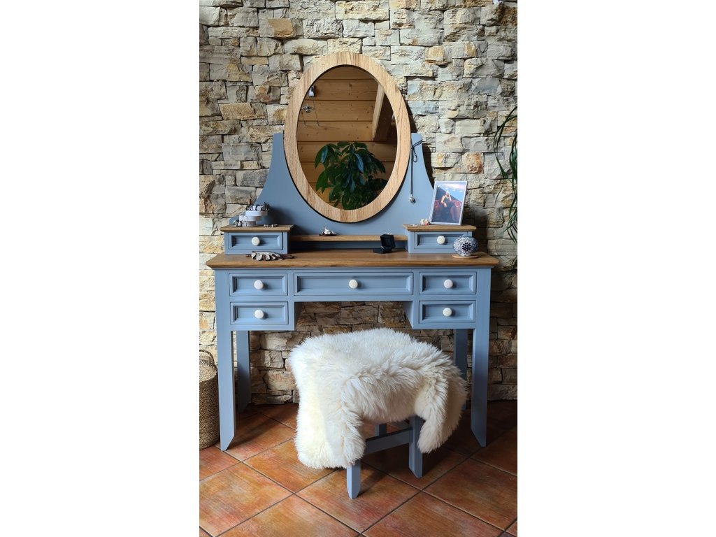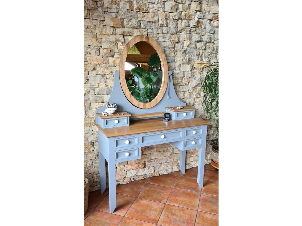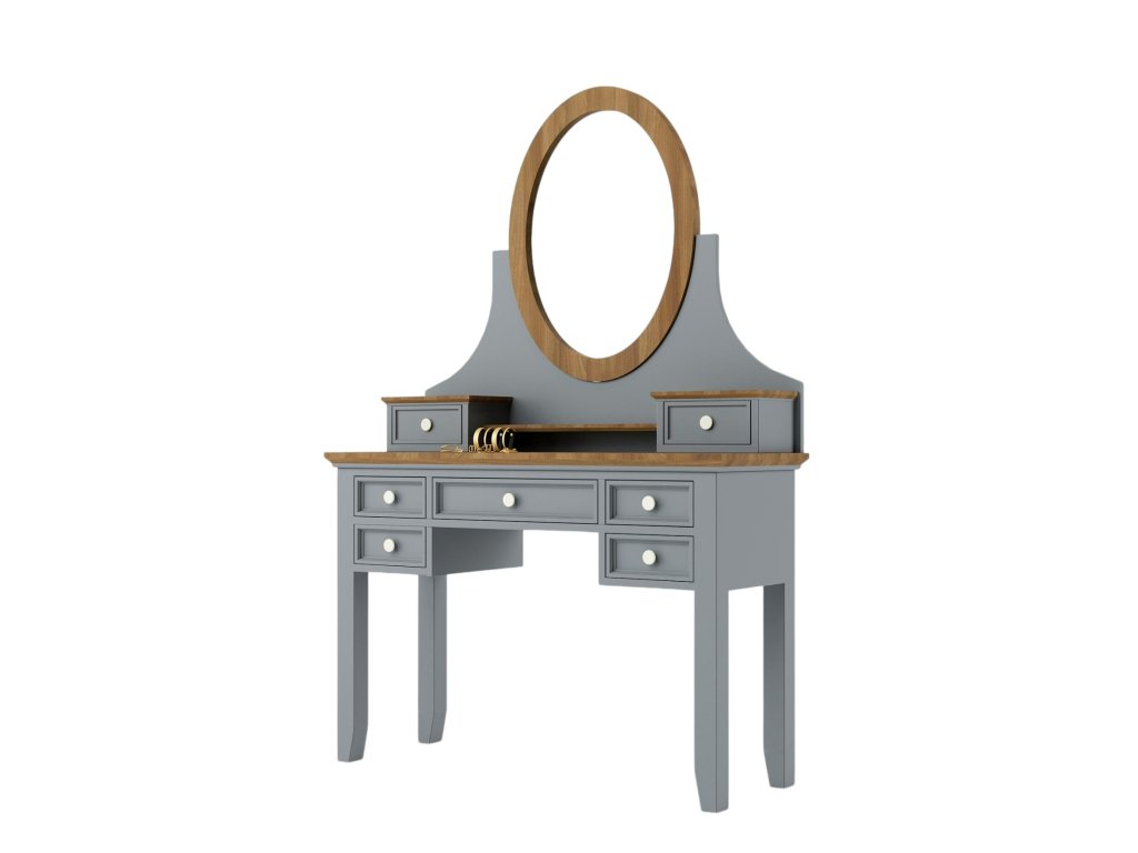 Masívny toaletný stolík PROVENCE je kombináciou bukového a dubového dreva. Dubové drevo (vrchná doska) je ošetrené lakom a bukové drevo je ošetrené akrylovou farbou sivomodrej farby. Zásuvky sú bez posunu. Možno objednať so systémom tichého zatvárania (pre zásuvky) - cena na vyžiadanie.
