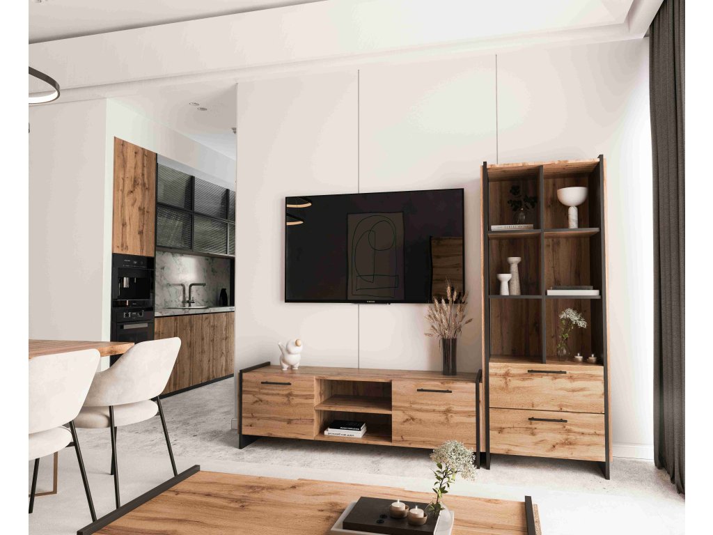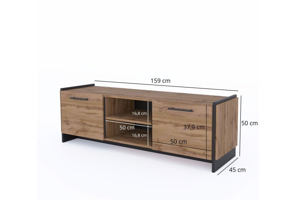 Vytvorte si z obývačky moderný a funkčný priestor pomocou televízneho stolíka AMINO. Jeho veľkorysá šírka 159 cm je ideálna na umiestnenie aj väčších televízorov a zároveň poskytuje dostatok plochy na vaše obľúbené dekorácie. Atraktívny industriálny vzhľad podčiarkuje kombinácia s dekorom 🌳 dub wotan/čierna.