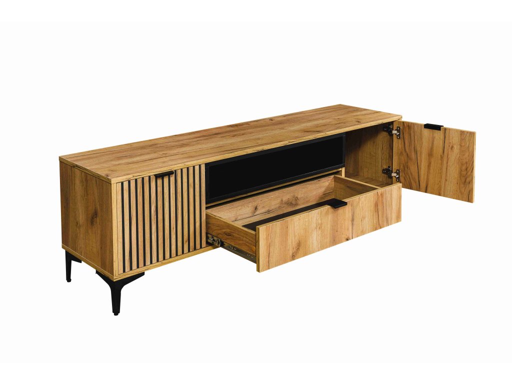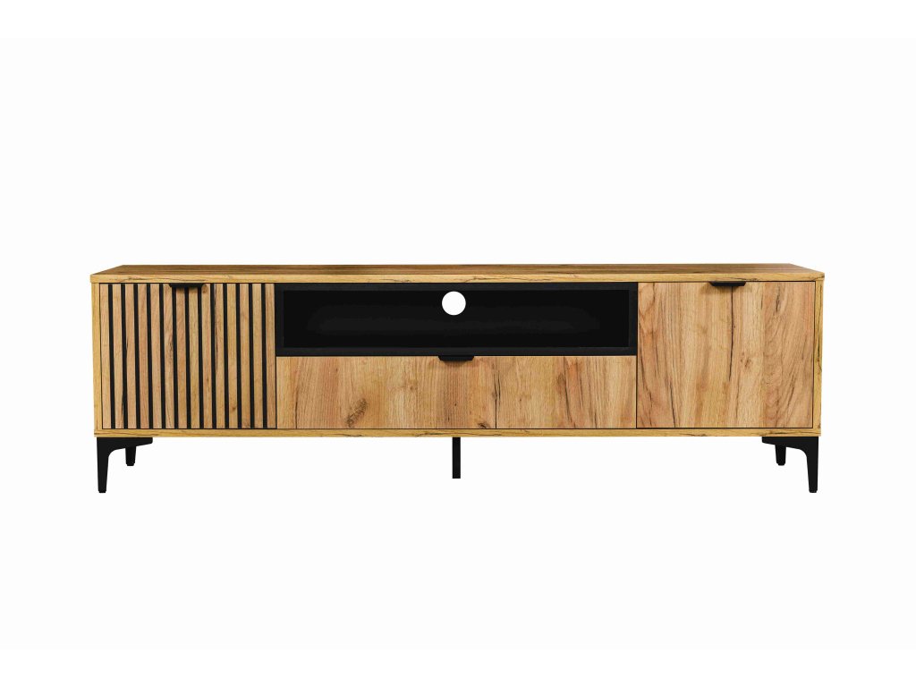 ELISE: moderný dizajn pre vašu obývaciu izbu Televízny stolík ELISE 2D1S je viac než len stojan na televízor. Je to dizajnový prvok, ktorý dotvorí atmosféru vášho interiéru. Inšpirovaný čistou prírodou kombinuje nádherný dekor zlatého duba s matnými čiernymi prvkami a minimalistickými kovovými detailmi. Hoci nie je vyrobený z masívneho dreva, pôsobí hrejivo a prirodzene.