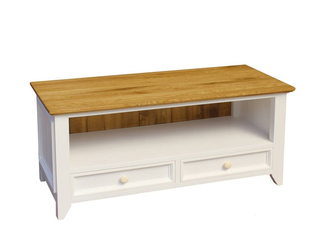 Masivní televizní stolek PROVENCE je spojením bukového a dubového dřeva. Dubové dřevo (horní deska) je ošetřeno olejem a bukové dřevo je ošetřeno akrylovou barvou v bílé barvě.