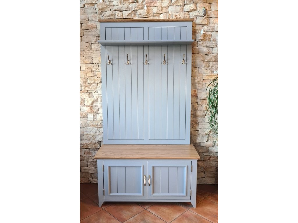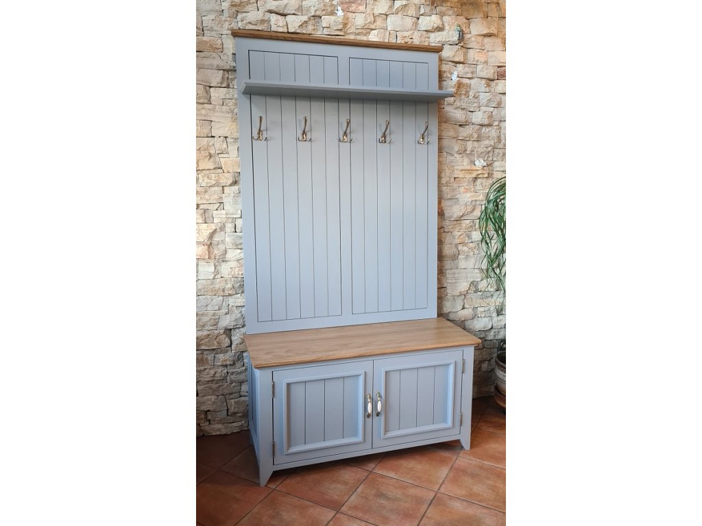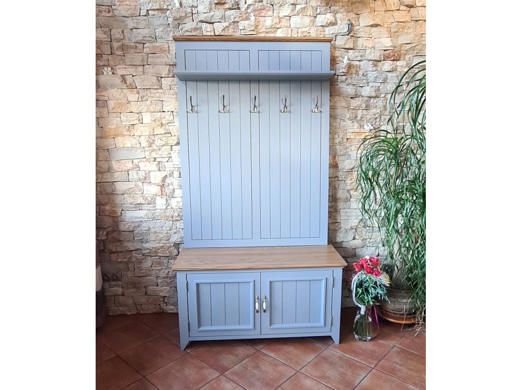 Predsieňová stena PROVENCE z masívu je kombináciou bukového a dubového dreva. Dubové drevo (vrchná časť) je ošetrené lakom a bukové drevo je ošetrené akrylovou farbou v bielej alebo sivomodrej farbe.