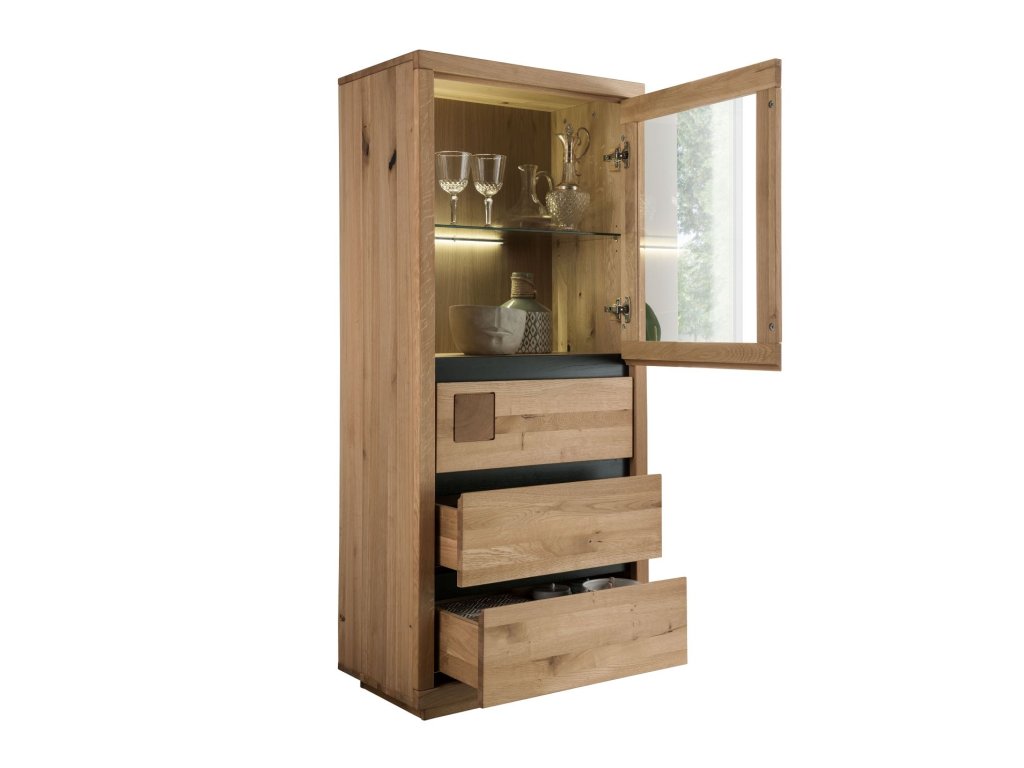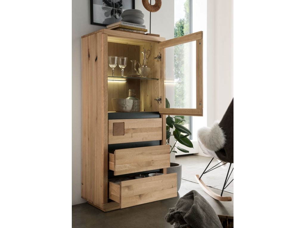 Masívne dubové drevo, z ktorého bola vitrína vyrobená, dodáva nábytku vysokú pevnosť, dlhú životnosť a odolnosť voči poškriabaniu a rozštiepeniu, ktoré sa môžu vyskytnúť pri každodennom používaní. Trvanlivosť dreva ešte zvyšuje olejový náter, ktorý zvýrazňuje prirodzenú štruktúru masívneho dreva s letokruhmi a nepravidelnými súknami, ktoré z nábytku robia jedinečný kus.