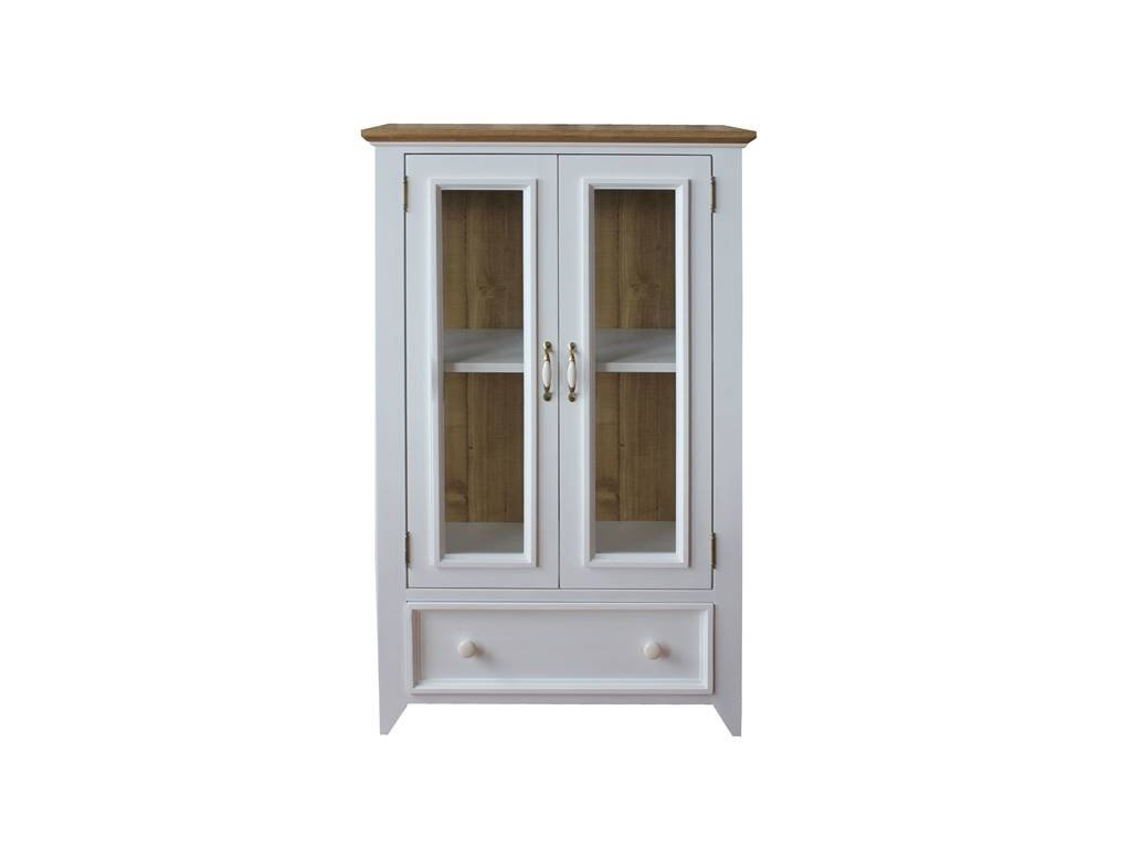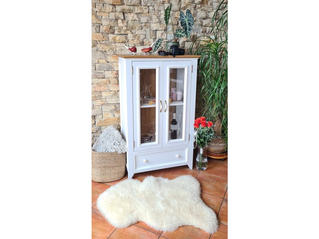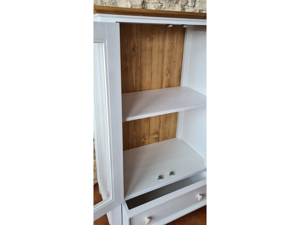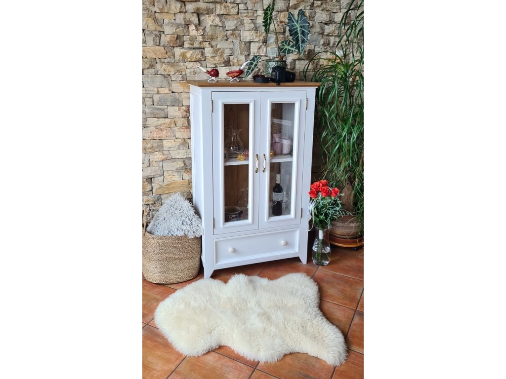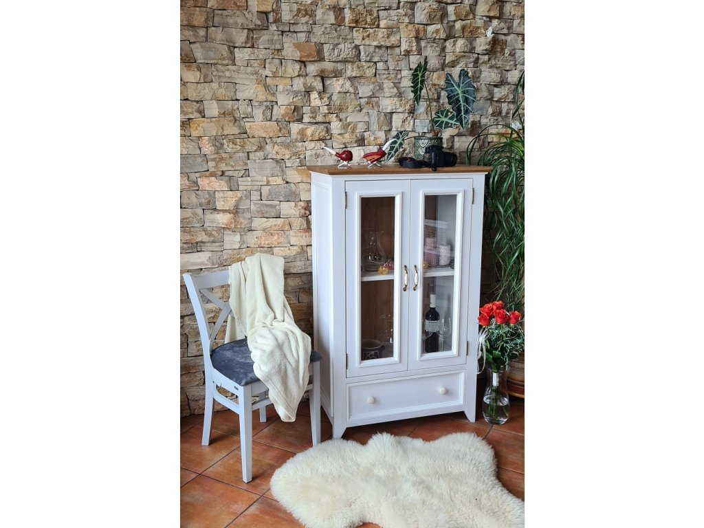 Masívna vitrína PROVENCE je kombináciou bukového a dubového dreva. Dubové drevo (vrchná časť) je ošetrené lakom a borovicové drevo je ošetrené akrylovou farbou bielej farby. Zásuvky sú bez bežcov. Možno objednať so systémom tichého zatvárania (pre zásuvky).