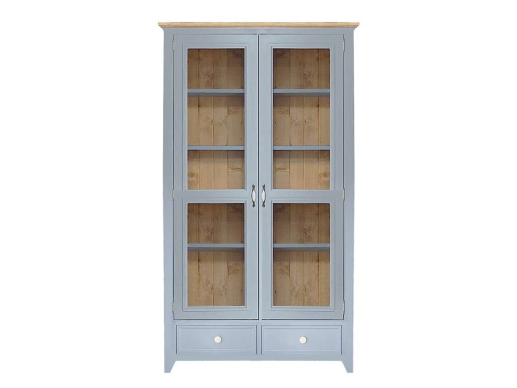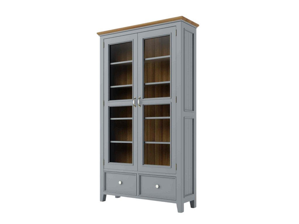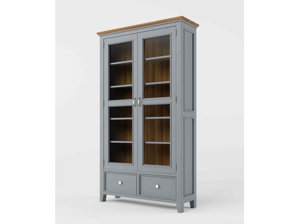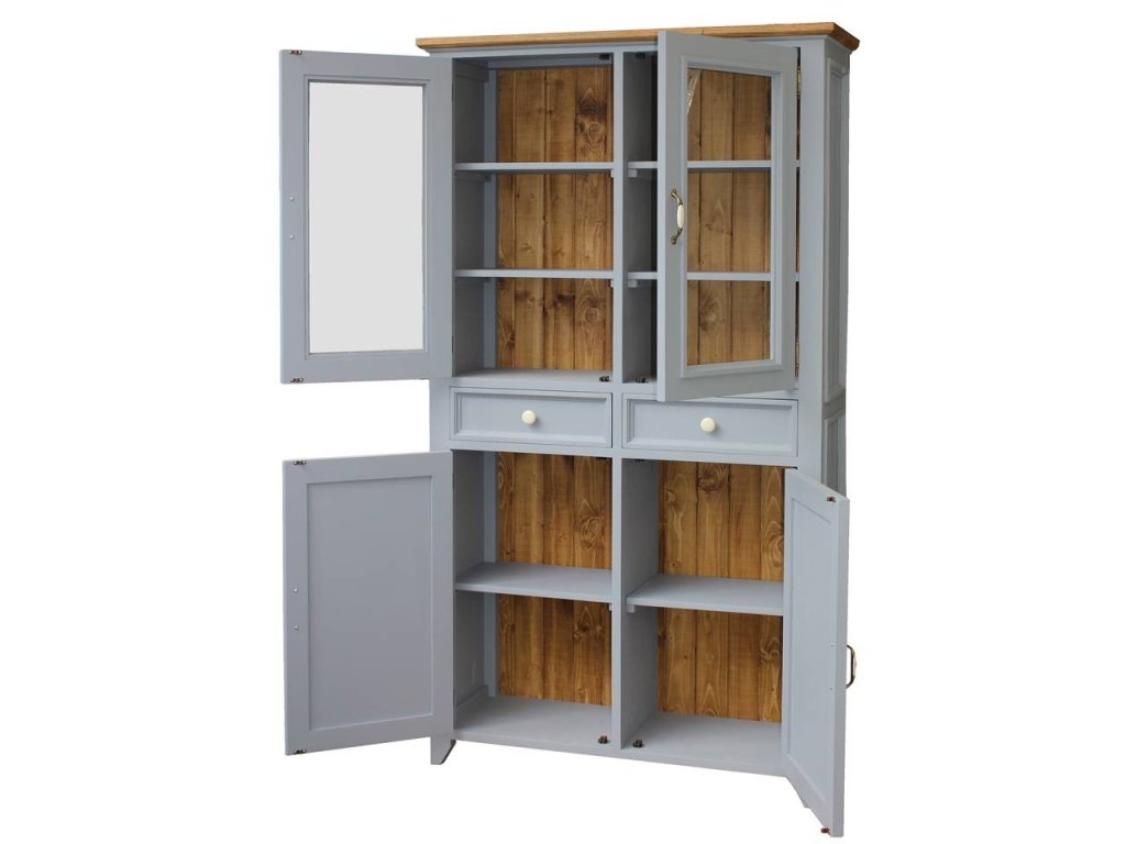 Masívna vitrína PROVENCE je kombináciou bukového a dubového dreva. Dubové drevo (vrchná doska) je ošetrené lakom a bukové drevo je ošetrené akrylovou farbou sivomodrej farby. Zásuvky sú bez bežcov. Možno objednať so systémom tichého zatvárania (pre zásuvky).