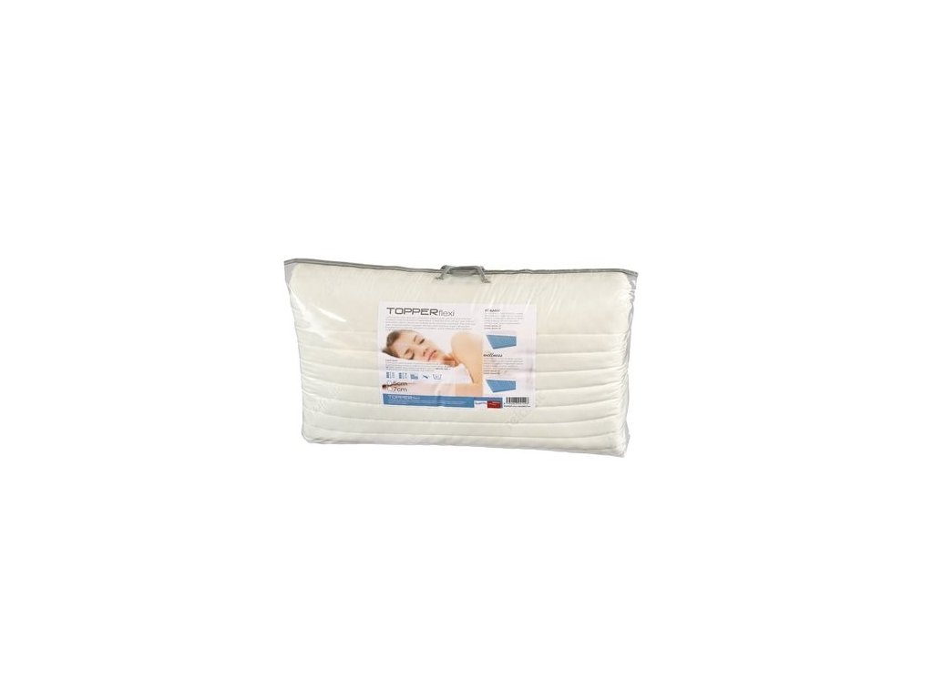 Vrchný matrac Topper FLEXI 5 cm je k dispozícii v dvoch variantoch: Klasik (plochá neprofilovaná pena Flexifoam®) a Wellness (masážne profily, ktoré prispievajú k lepšiemu prekrveniu a relaxácii). Gumové pásy upevnené v rohoch zaisťujú dokonalú fixáciu k matracu. Súčasťou vrchného matraca je aj poťah, ktorý sa dá ľahko sňať a prať na 60 °C.