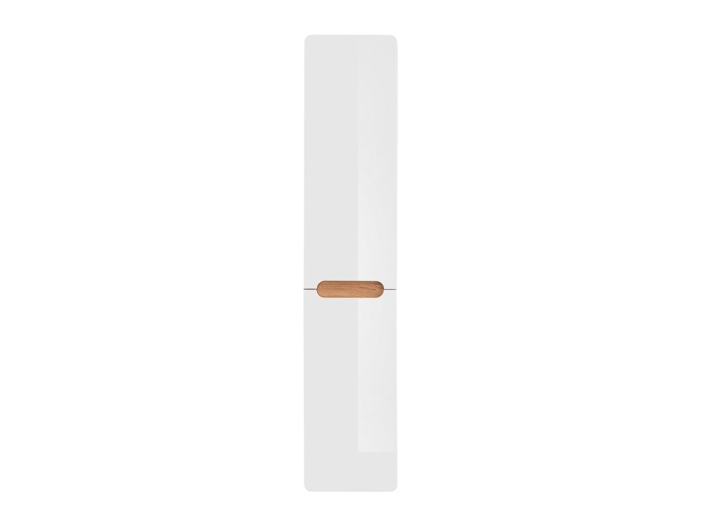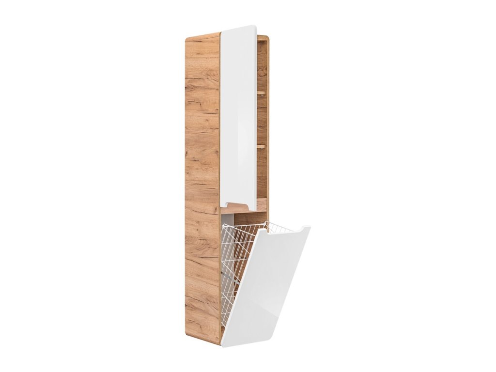 Vysoká kúpeľňová skrinka s košom na bielizeň Aruba White je kvalitnádrevená skrinka vhodná do kúpeľne alebo práčovne. Skriňa ponúka dostatok úložného priestoru prostredníctvom dvoch drevených políc v hornej časti skrine. Výklopný kôš na bielizeň je efektívne ukrytý v spodnej časti skrinky. Korpus skrinky je vyrobený v dekore zlatého duba, ktorý dopĺňajú lesklé biele dvierka vybavené systémom tichého zatvárania.